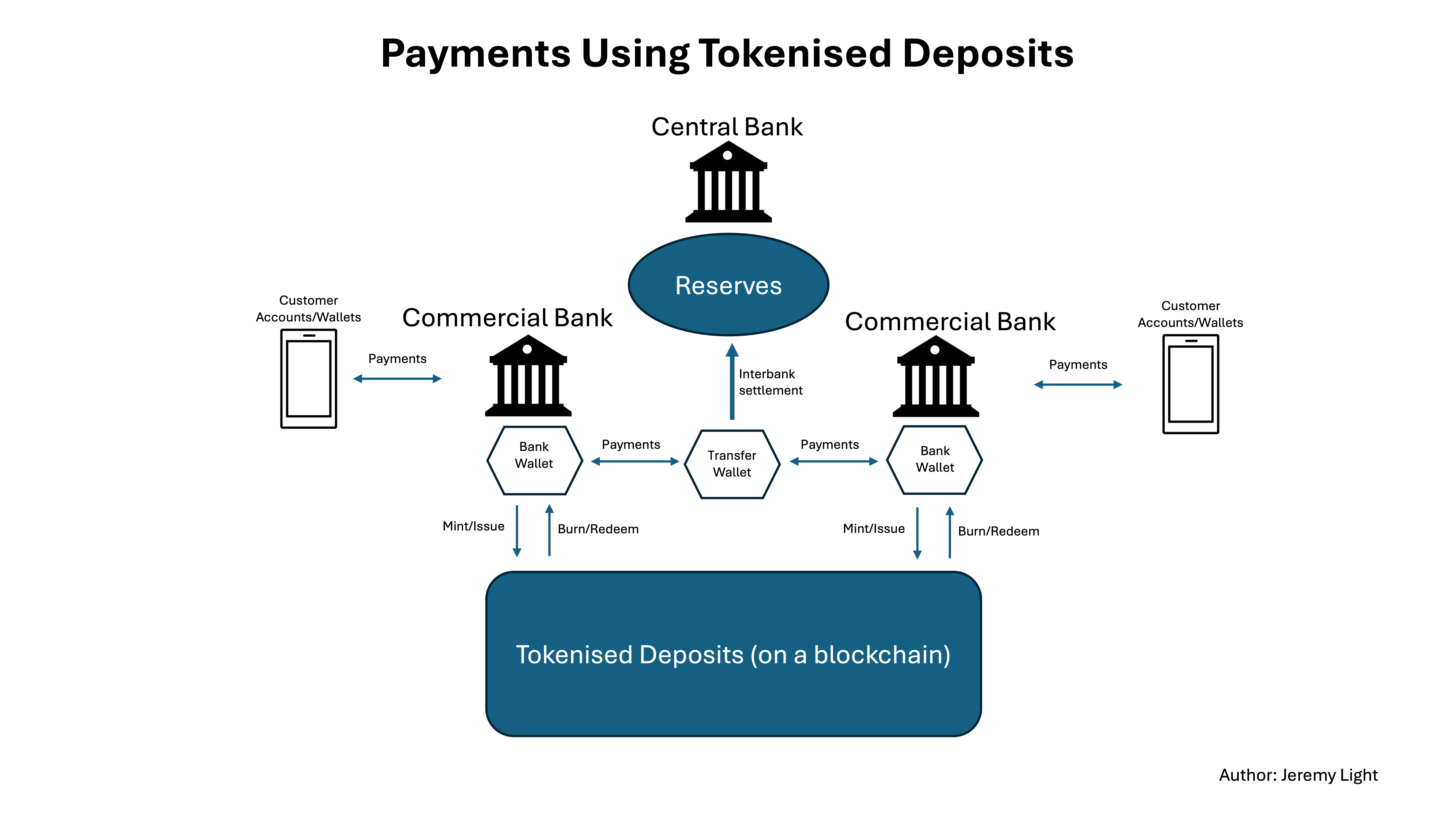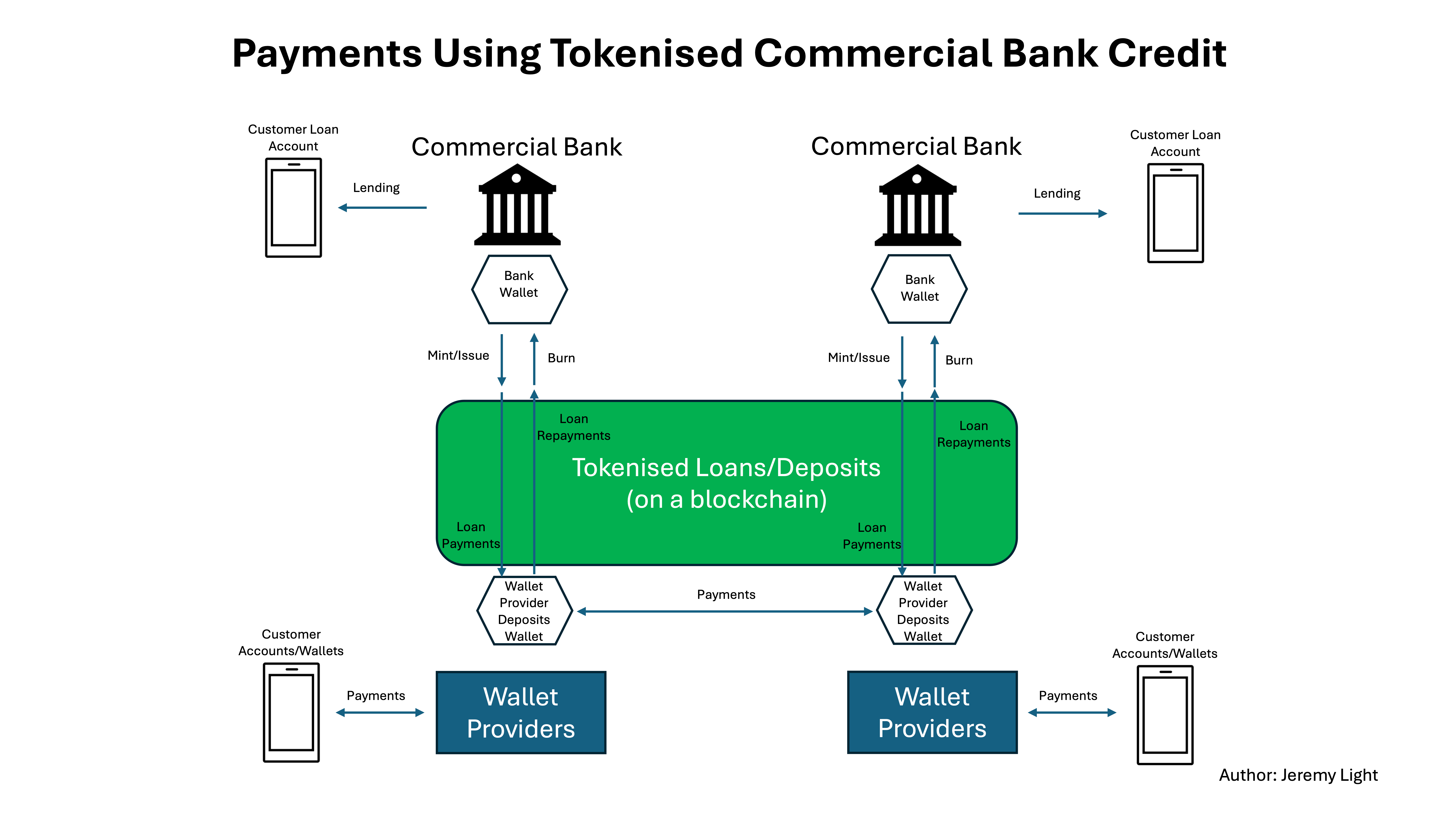 Commercial banks have wallets on the same blockchain and issue tokens on it to the value of each loan they make. The loans are credited to the borrower for use in payments. Consumers and business have wallets to make payments over the blockchain. Loans are repaid by the borrower by sending tokens to their lender, who burns them to extinguish the loan.