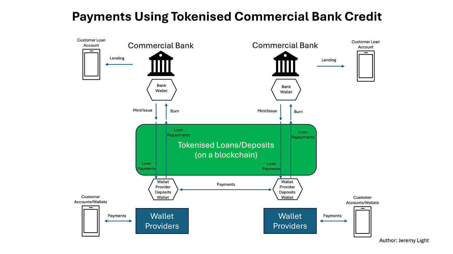 In this article, for context I summarise how commercial bank money is created and used in payments. I look at the status of stablecoins and tokenised deposits and I propose tokenised commercial bank credit as a safer, more efficient and elegant alternative.