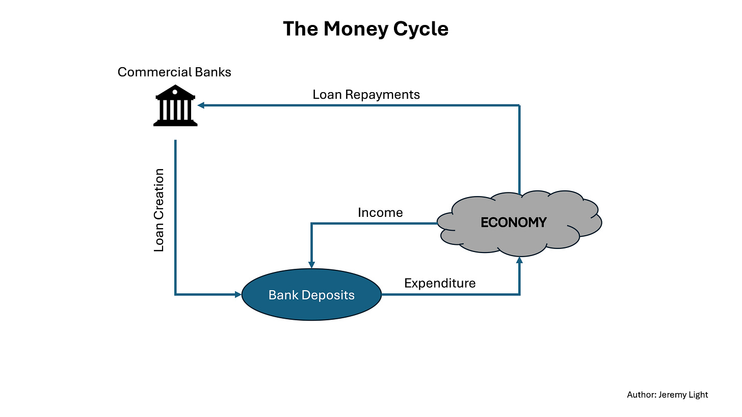 The Money Cycle in Figure 1 shows the process. Bank deposits are the result of loan creation and circulate in the economy through payments, both as income and expenditure. As individuals and businesses accumulate bank deposits through their productive activities, they are able to pay off any loans they have over time, completing the cycle, which then repeats on a continual basis.
