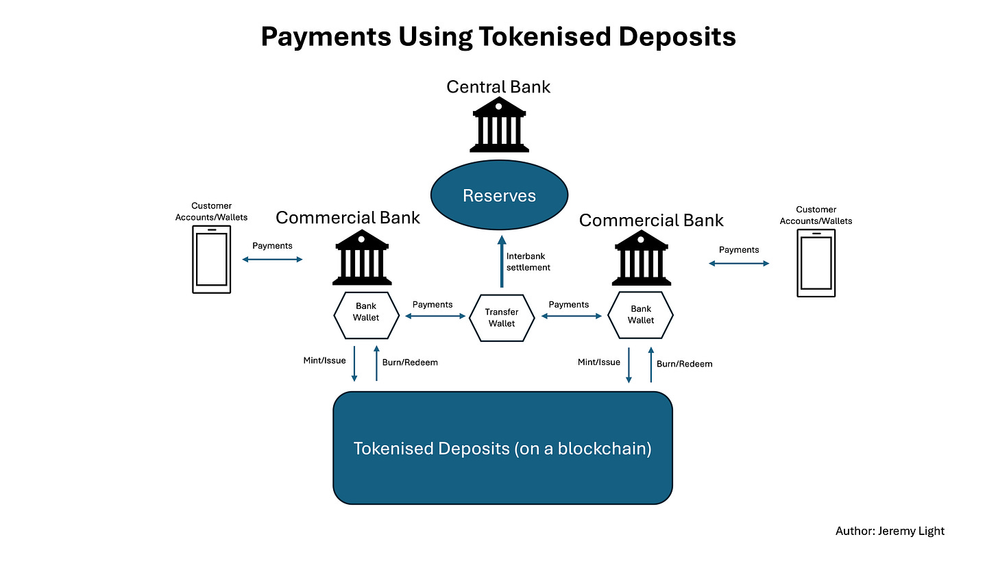 Tokenising deposits on a blockchain within a bank for its own customers is straightforward but payments between banks using tokenised deposits is difficult. It requires all banks to be on the same ledger or an interoperability mechanism to be in place.