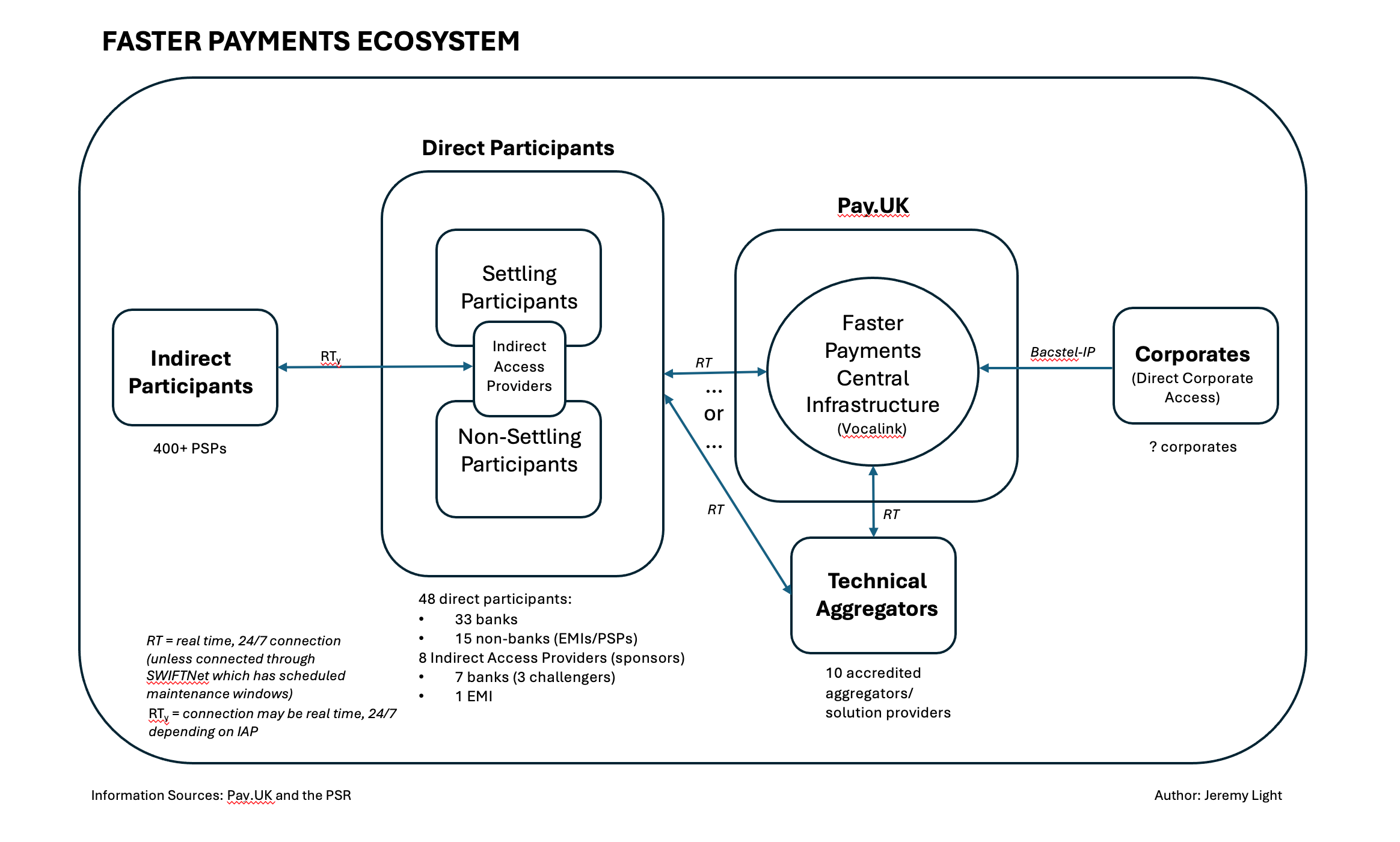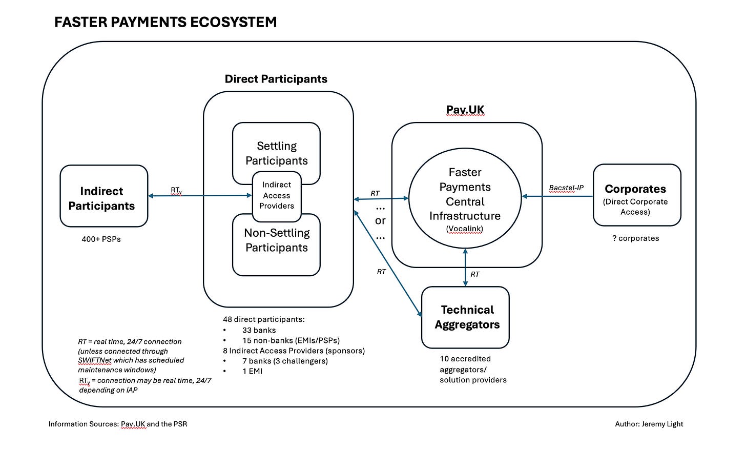 I expect that all Faster Payments sponsors, or Indirect Access Providers use settlement accounts at the BoE, therefore they are settling participants in the Faster Payments scheme. However, since no information is published on direct participants who use settlement accounts, I have shown IAPs straddling both settling and non-settling direct participants in the diagram above.